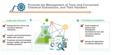 In terms of management approach, the Administration obtains comprehensive insights into the handling and flow of toxic and concerned chemical substances through audits and verification of reporting records from handling and reporting systems. Simultaneously, on-site audit operations are conducted to identify and trace any unusual handling practices. Additionally, the Administration conducts annual post-market investigations and provides guidance concerning toxic and concerned chemical substances. These initiatives encompass thorough examinations of how business entities genuinely use and manage these substances, including delving into process intricacies, equipment components, toxicity levels, and the roles played by these substances in the manufacturing process. This investigation also encompasses evaluating reaction conditions, product types, and other relevant factors. Furthermore, the Administration actively assists business entities in formulating pollution flow diagrams and effectively managing the pollution.