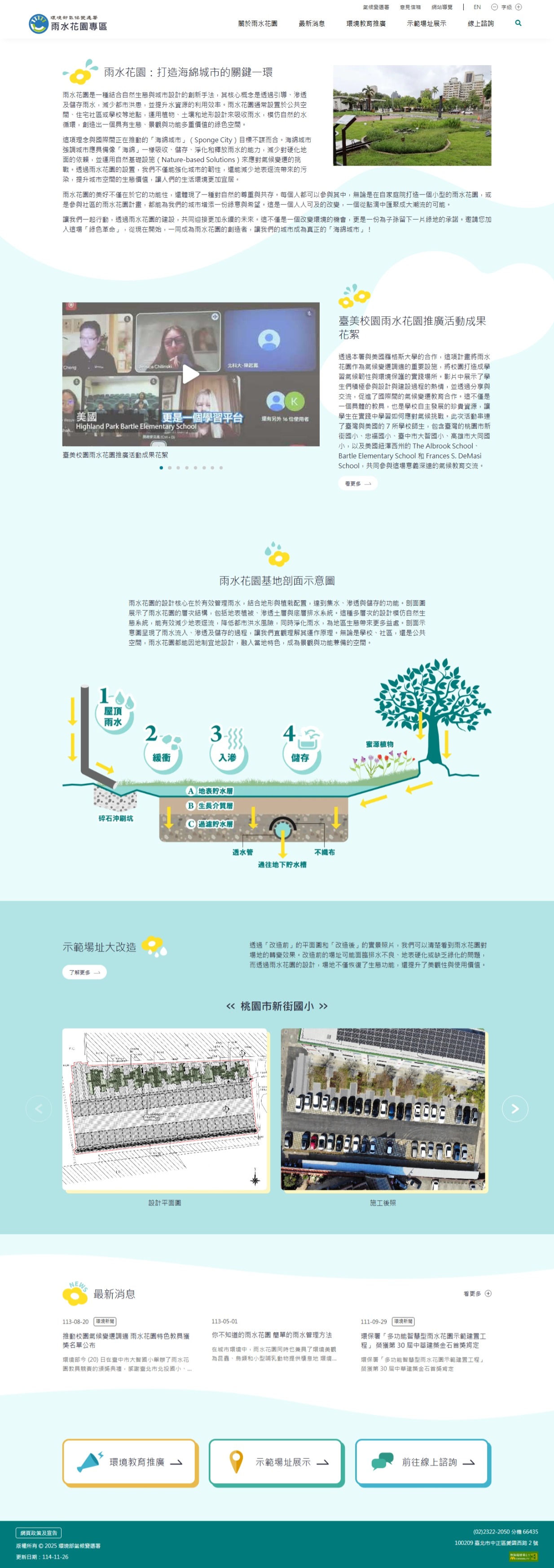 為推廣「海綿城市(Sponge City)」理念,環境部氣候變遷署建置「雨水花園專區」,以全臺示範場址為核心,透過圖文導覽呈現各地雨水花園的設計特色與施工成果,展現雨水花園在滯洪、降溫、淨化水質及改善都市環境等面向的多元功能。