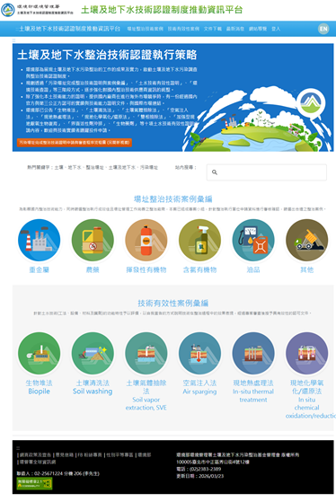 為結合國際發展趨勢,強化國內土壤及地下水實務技術交流與技術推廣,展現我國推動土壤及地下水整治技術成果,建置土壤及地下水技術認證制度資訊平台,本網站提供「污染場址整治技術證明」及「整治技術有效性自我宣告證明」之申請、審查及查詢等功能,並公開已核發證明供民眾調覽與媒合,促進我國土壤及地下水污染場址改善工作,提升整治技術能力與管理品質。