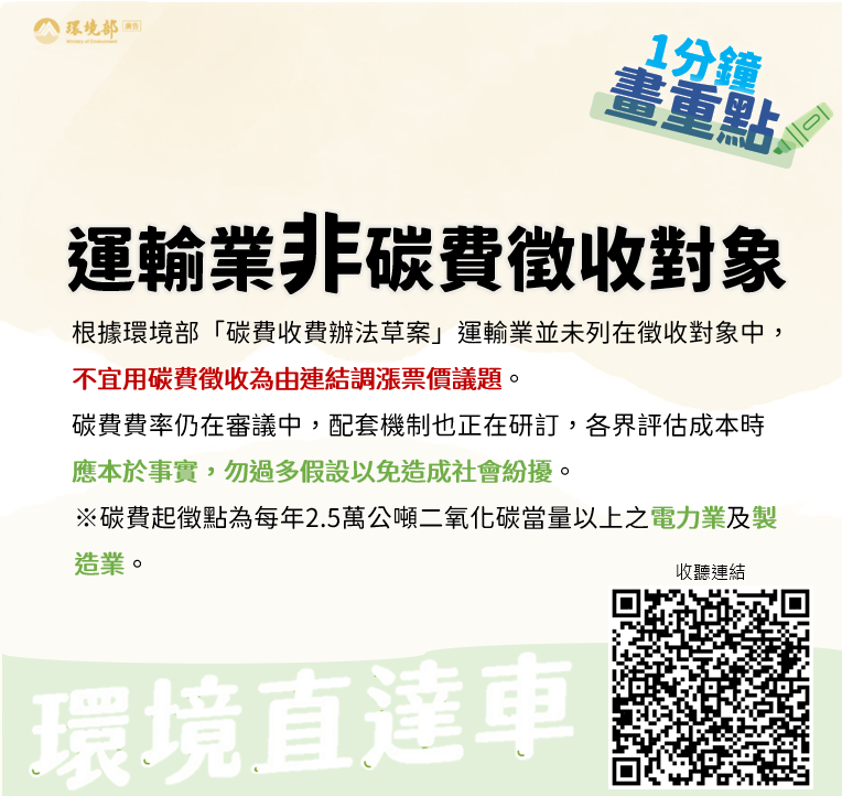 環境部新聞專區【運輸業非碳費徵收對象,應無漲票價壓力大之情況】