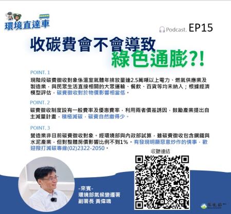 了解,針對會不會通膨這件事情大家是不用擔心的,因為剛剛副座也提到說收費的對象其實是很源頭、很源頭的大型的排放源,它並不是針對所有民生,就是跟我們相關每天碰得到的去徵收,然後再來就是說企業也不用真的過度擔心,因為剛剛副座也有提到,其實我們是設計一整個有配套的,包含只要你願意減碳,我們是會給你優惠費率的這樣子。