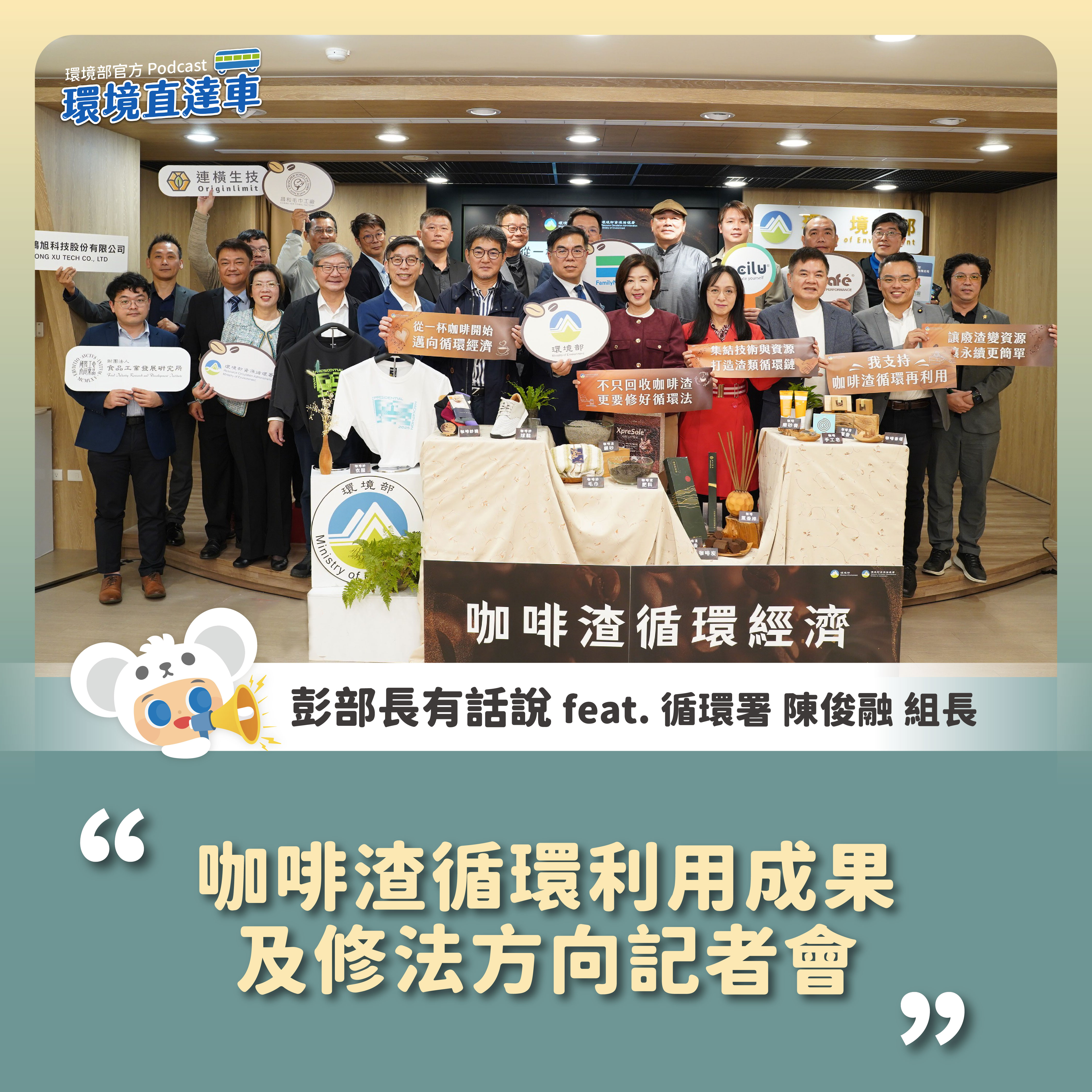 環境部今(30)日邀請立法委員及咖啡渣料源廠商、再利用業者共同召開記者會,宣布啟動咖啡渣循環經濟。現場展示咖啡渣做成的衣服、貓砂、磨砂膏等商品,並由環境部彭啓明部長說明突破咖啡渣之回收難、處理難、媒合難的解方;為加速推動咖啡渣循環經濟,環境部已提出「廢棄物清理法」及「資源循環推動法」雙法的修正案,透過導入「創新實驗沙盒」給予制度彈性,並增訂「公部門循環採購」規範,由政府示範帶動民間動能。環境部期盼藉此修法實現從「末端處理」轉向「全生命週期循環」的願景,達成資源最大化與廢棄物最小化的永續目標,盼立法院能支持。
